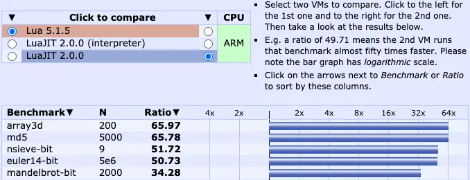 由於 LuaJIT 在開啓 JIT 的情況下可以數十倍提升 Lua 代碼執行效率,所以非常多遊戲/框架都採用 LuaJIT 替代官方 Lua 虛擬機。