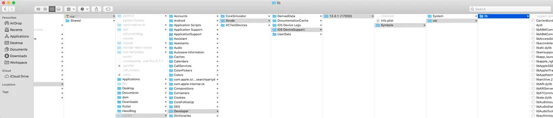 我們每次真機連接 Xcode 運行程序,會提示等待,其實系統為了堆棧解析,都會把當前版本的系統符號庫自動導入到 /Users/你自己的用户名/Library/Developer/Xcode/iOS DeviceSupport 目錄下安裝了一大堆系統庫的符號化文件。你可以訪問下面目錄看看