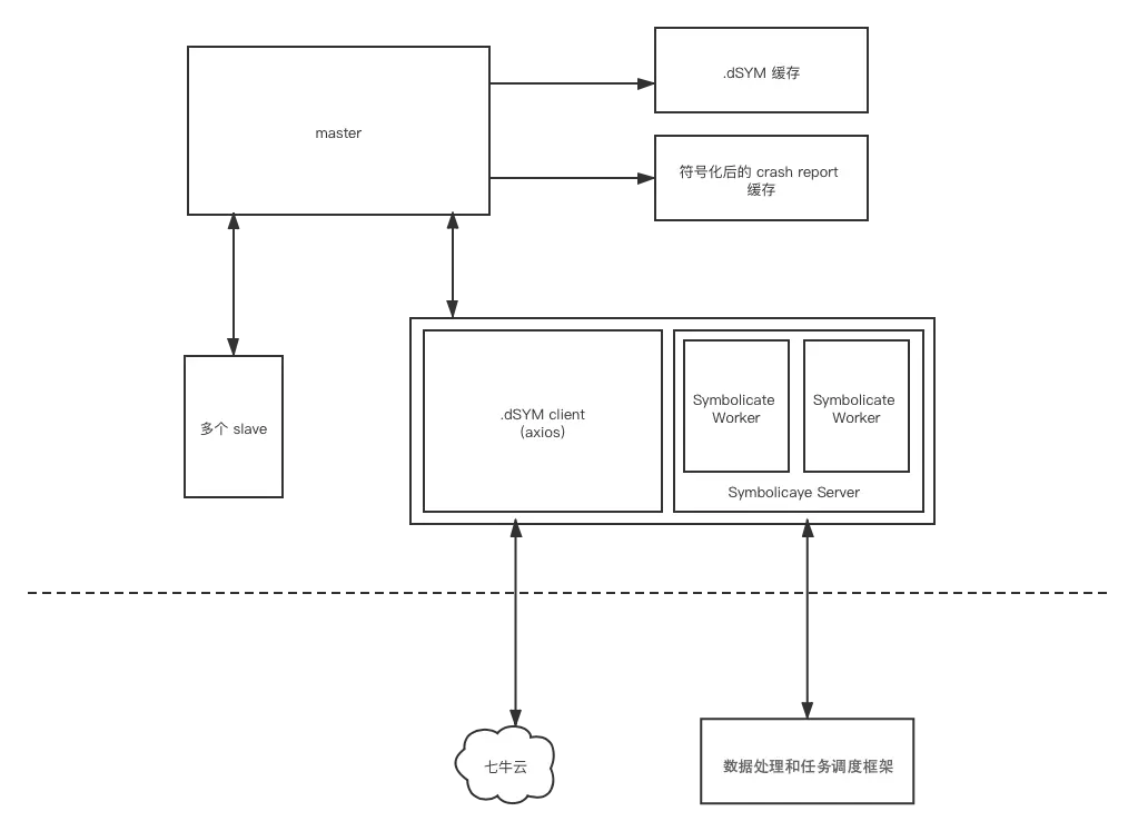 簡單説明下,符號化流程是一個主從模式,一台 master 機,多個 slave 機,master 機讀取 .DSYM 和 crash 結果的 cache。「數據處理和任務調度框架」調度符號化服務(內部2個 symbolocate worker)同時從七牛雲上獲取 .DSYM 文件。