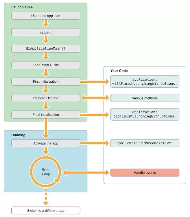 RunLoop 負責監聽輸入源進行調度處理。比如網絡、輸入設備、週期性或者延遲事件、異步回調等。RunLoop 會接收2種類型的輸入源:一種是來自另一個線程或者來自不同應用的異步消息(source0事件)、另一種是來自預定或者重複間隔的事件。