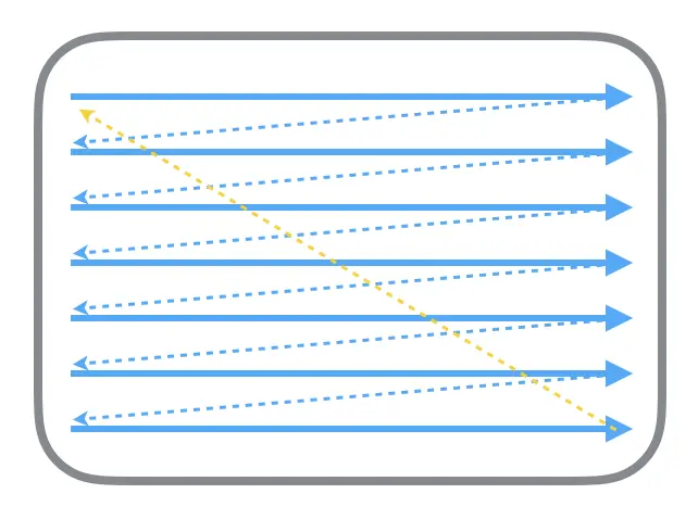 講講老式的 CRT 顯示器的原理。 CRT 電子槍按照上面方式,從上到下一行行掃描,掃面完成後顯示器就呈現一幀畫面,隨後電子槍回到初始位置繼續下一次掃描。為了把顯示器的顯示過程和系統的視頻控制器進行同步,顯示器(或者其他硬件)會用硬件時鐘產生一系列的定時信號。當電子槍換到新的一行,準備進行掃描時,顯示器會發出一個水平同步信號(horizonal synchronization),簡稱 HSync;當一幀畫面繪製完成後,電子槍恢復到原位,準備畫下一幀前,顯示器會發出一個垂直同步信號(Vertical synchronization),簡稱 VSync。顯示器通常以固定的頻率進行刷新,這個固定的刷新頻率就是 VSync 信號產生的頻率。雖然現在的顯示器基本都是液晶顯示屏,但是原理保持不變。