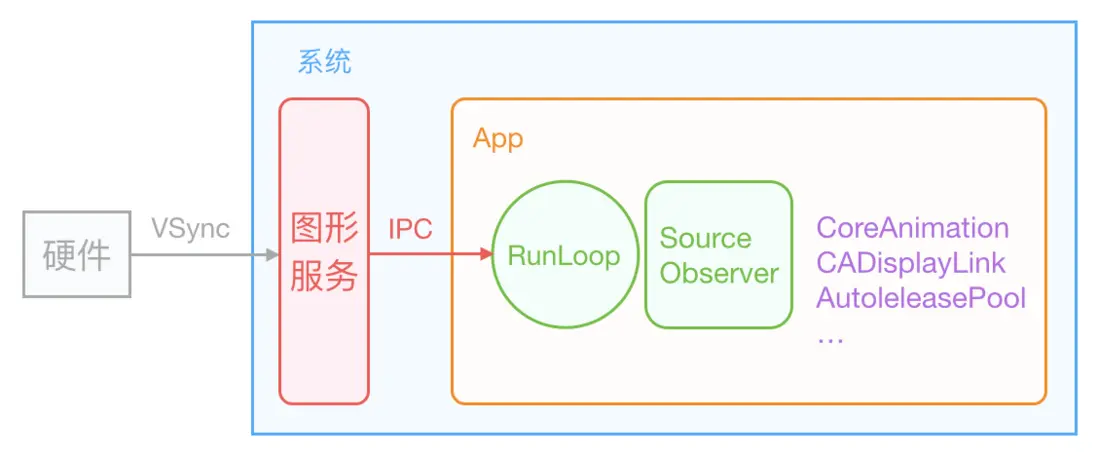 VSync 信號到來後,系統圖形服務會通過 CADisplayLink 等機制通知 App,App 主線程開始在 CPU 中計算顯示內容(視圖創建、佈局計算、圖片解碼、文本繪製等)。然後將計算的內容提交到 GPU,GPU 經過圖層的變換、合成、渲染,隨後 GPU 把渲染結果提交到幀緩衝區,等待下一次 VSync 信號到來再顯示之前渲染好的結果。在垂直同步機制的情況下,如果在一個 VSync 時間週期內,CPU 或者 GPU 沒有完成內容的提交,就會造成該幀的丟棄,等待下一次機會再顯示,這時候屏幕上還是之前渲染的圖像,所以這就是 CPU、GPU 層面界面卡頓的原因。