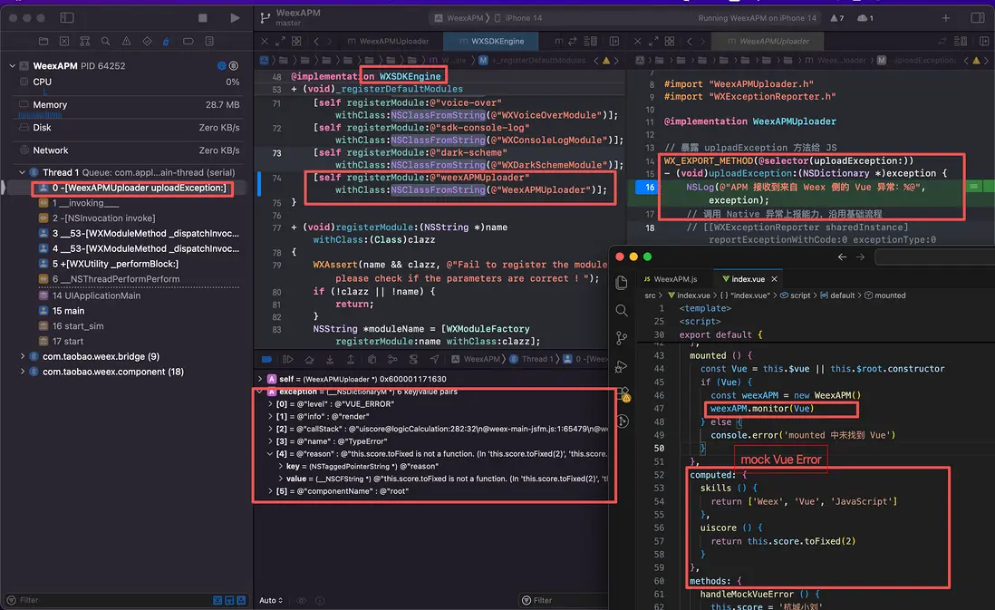 Weex 底層依靠 Vue 實現,差異化就是 VM 去通過 Bridge 在 WeexSDK Native 去做繪製。異常方面除了常規的 JS 運行時異常(如語法錯誤、類型錯誤等 7 種),Vue 框架自身的邏輯層、編譯層、響應式系統、組件生命週期 等環節會拋出專屬異常,這些異常必須通過 Vue.config.errorHandler 兜底。