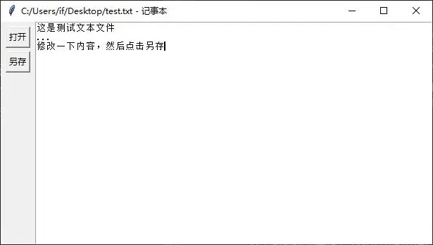 為了測試記事本的文件另存功能,我們先用我們最新修改的記事本程序打開上面手動創建的文本文件 test.txt,然後在編輯框把內容修改一下