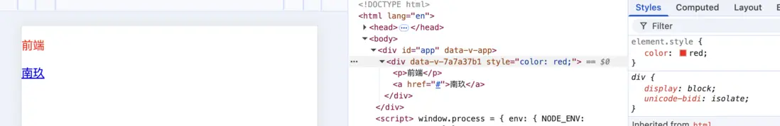 同樣還是上面的代碼,我們可以看到對於p標籤我們既沒有聲明他的文字顏色,用户代理樣式表同樣也沒聲明文字顏色,那麼它的紅色是從哪來的呢?