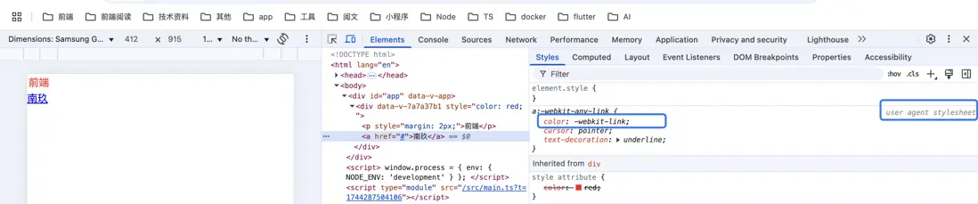 因為對於a標籤來説,雖然沒有自定義聲明color,但用户代理樣式表中有聲明color,所以會直接使用用户代理樣式表中的color值,而不會使用繼承值。