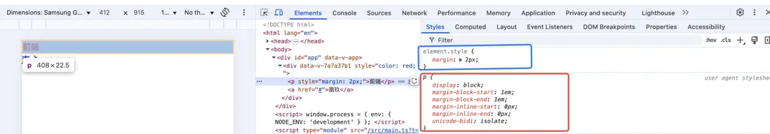 由於開發者自定義聲明樣式表與用户代理樣式表都有定義margin值,最終應用的是開發者自定義聲明樣式表,所以開發者自定義聲明樣式表的權重要高於用户代理樣式表