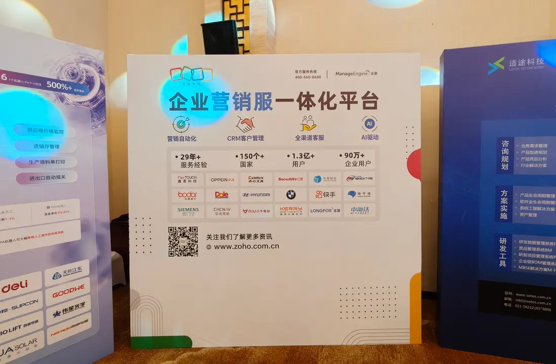 作為全球企業服務領域的深耕者,Zoho 攜 Zia 智能助手生態及工業 AI 解決方案亮相,依託自主研發的全棧技術棧,提供從流程自動化到智能決策的全週期服務。其 AI 智能體矩陣可實現生產協作優化、銷售效率提升等核心場景落地,助力製造業打破信息孤島,降低轉型成本。