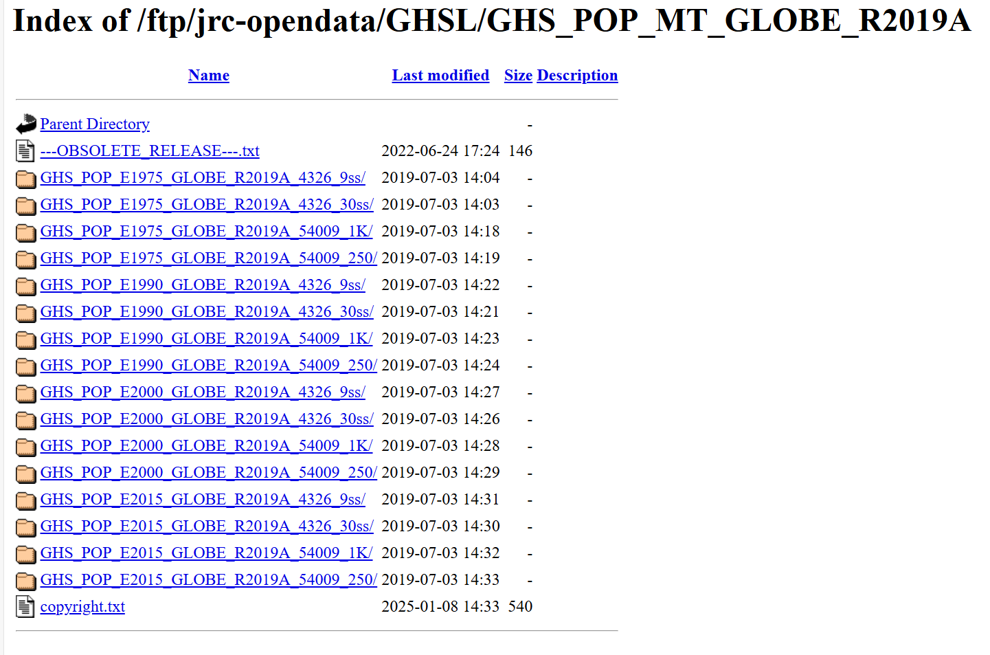 GHSL(Global Human Settlement Layer)是歐盟委員會聯合研究中心(Joint Research Centre)大數據分析平台(Big Data Analytics Platform)提供的全球多種空間分辨率、多種投影方式的人口定居數據。需要注意,上面給出的網站就是其數據存檔網址,所以點進去只有一堆數據文件,如下圖所示。
