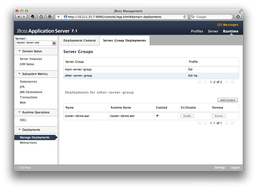 在Manage Deployments頁面,點擊Add Content,然後選擇我們之前的demo應用程序cluster-demo.war,上傳即可。