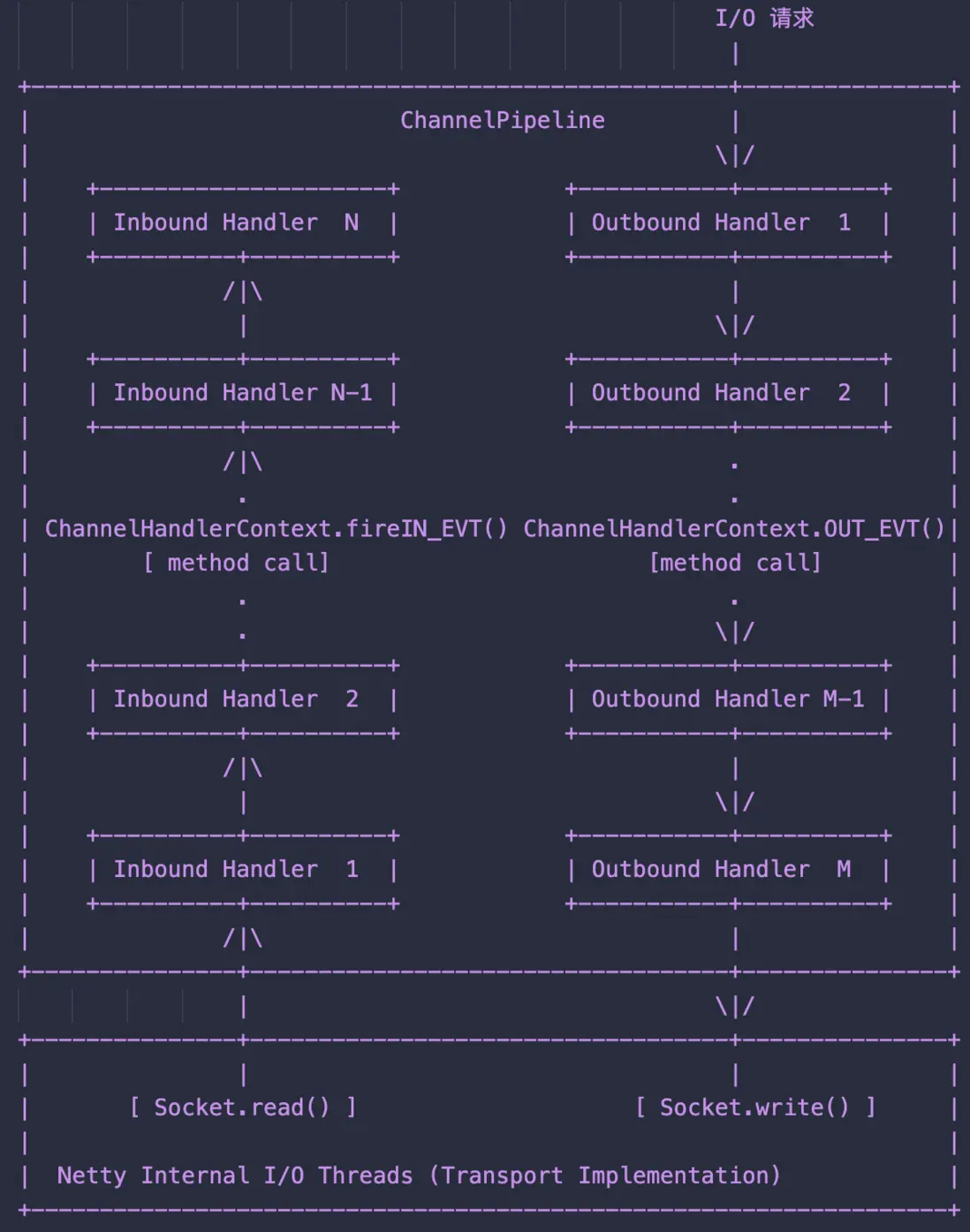 對於Socket.read()這樣的讀入操作,調用的實際上就是ChannelInboundInvoker中的方法。對於外部的IO寫入的請求,調用的就是ChannelOutboundInvoker中的方法。