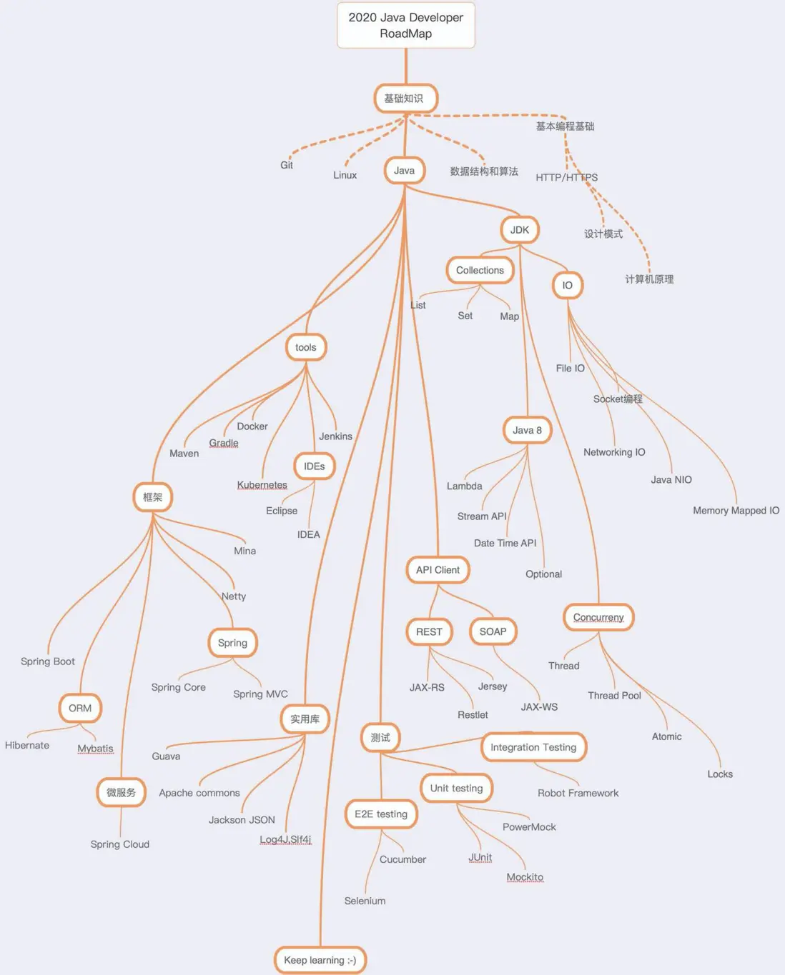 上面的RoadMap圖中列出了作為一個java程序員需要掌握的技術路線,所有技術都懂那當然非常好,如果還沒掌握也沒關係,just keep learning!