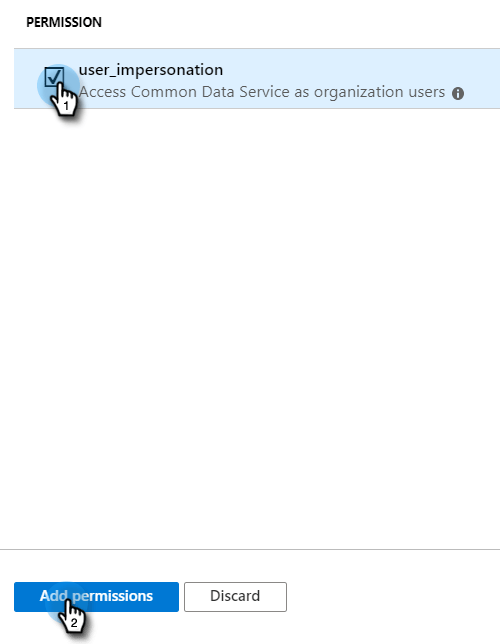 5. 核取​ Access Common Data Service as organization users ​方塊,然後按一下​ Add permissions.