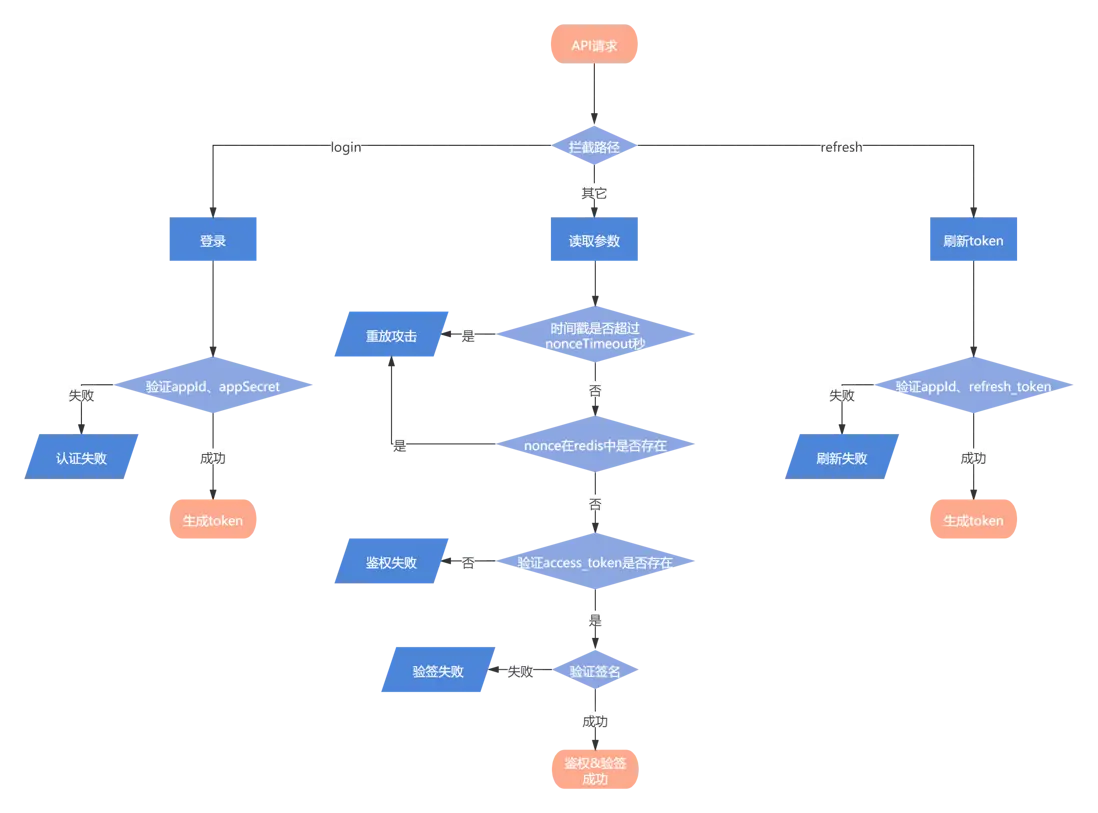 開發者認證也就是登錄校驗,網關校驗用户上送的appId和appSecret,如果跟redis中保存的一致,則生成access_token和refresh_token並返回給用户,用户暫存該token,訪問其它API接口時需要上送access_token。