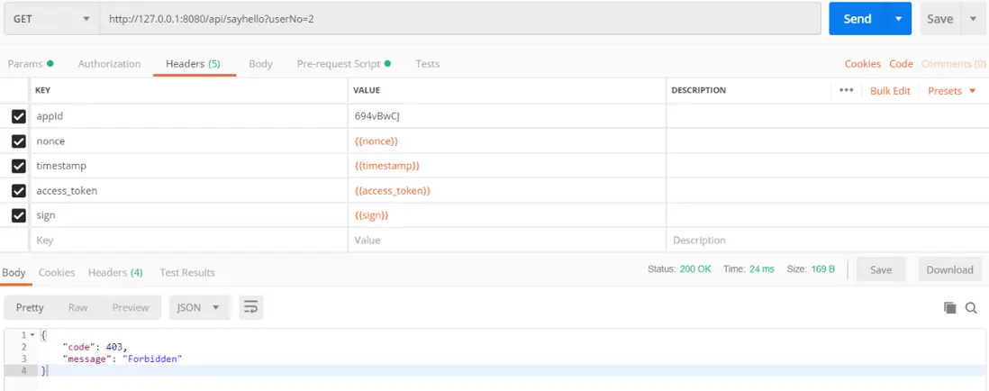 在Postman的Pre-request Script中將簽名sign的值變更,請求報錯“Forbidden”,即驗證簽名不通過。