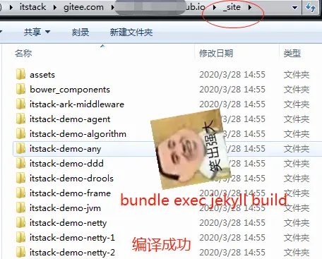 bundle exec jekyll clean)和構建(bundle exec jekyll build),接下來看以看到文件下的_site內容的生成。