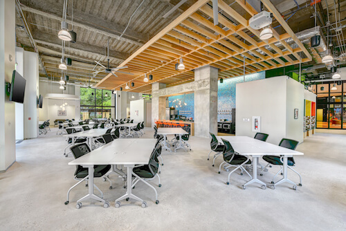 - Description: This brand new 33,000 square foot campus, centrally located across the street from the 7th and Grand Metro station, features beautiful floor-to-ceiling wraparound windows and a “California modern” design that creates a bright, productive vibe. With a fully serviced bar, showers and a rejuvenation room, Cross Campus also has a packed schedule of events focusing on startups, tech and a range of other themes.