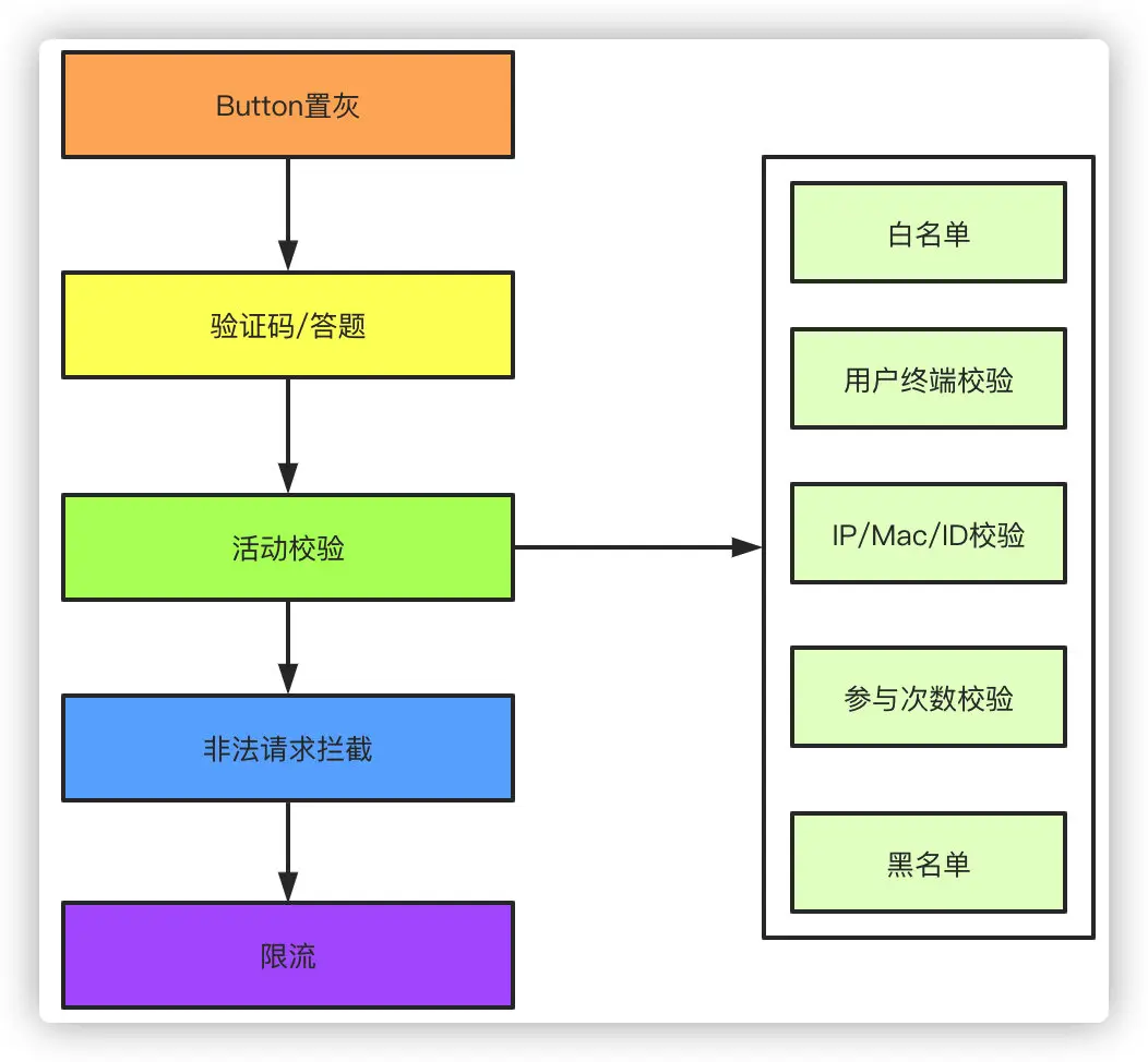 - 活動校驗,既然是活動,那麼活動的參與用户,參加條件,用户白名單之類的要首先做一層校驗攔截,還有其他的比如用户終端、IP地址、參與活動次數、黑名單用户的校驗。比如活動主要針對APP端的用户校驗,那麼根據參數其他端的用户將被攔截,針對IP、mac地址、設備ID和用户ID可以對用户參與活動的次數做校驗,黑名單根據平時的活動經驗攔截掉一部分羊毛黨等異常用户。