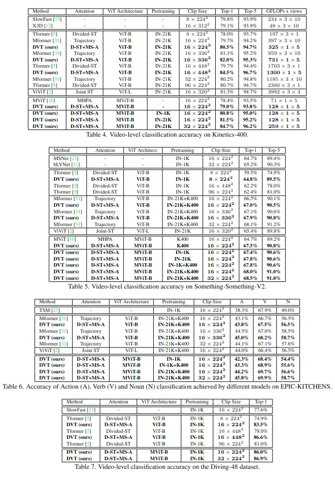 在四個標準視頻分類基準上評估DVT:Kinetics-400(K400)、Something-Something-V2(SSv2)、EPIC-KITCHENS-100(EK100)和Diving-48(D48)
