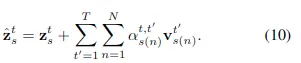 其中的相似度矩陣\( {\boldsymbol{\alpha}}_{s}^{t, t^{\prime}} \in R^N \)與之前的計算方式不同,而是根據查詢點特徵和運動嵌入特徵計算而來的,公式如下: