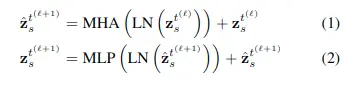 然後通過多頭自注意力,layer norm(LN)和MLP計算,可以表示如下: