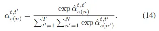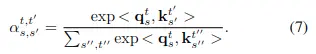 計算複雜度為\( O(S^2T) \)對應的時間注意力計算公式如下: