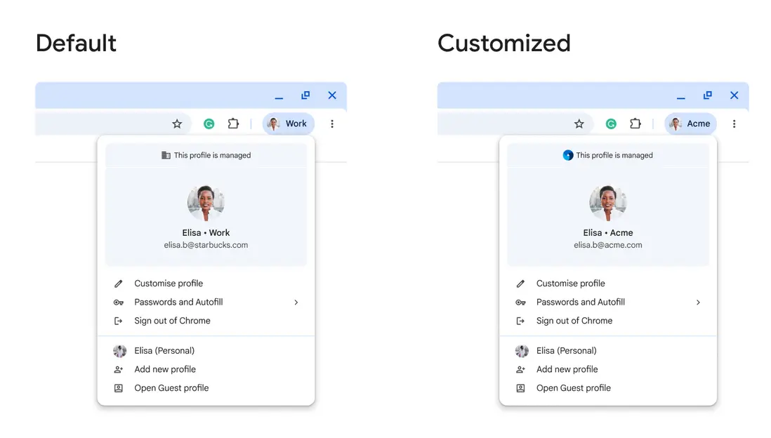Chrome 推出了 新的工具欄和個人資料菜單自定義功能,幫助用户更容易識別 其 Chrome 個人資料是否受管理,無論是 工作設備 還是 個人設備