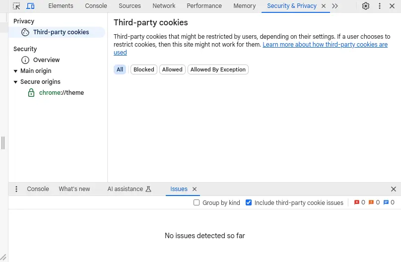 Chrome 134 開始,開發者可以在 Chrome DevTools(開發者工具) 中使用全新的 “安全與隱私”(Security & Privacy) 面板,測試當 第三方 Cookie 受限 時,網站的行為表現。
