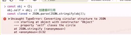 如果對象中存在循環引用,調用 JSON.stringify 會拋出錯誤,導致克隆失敗
