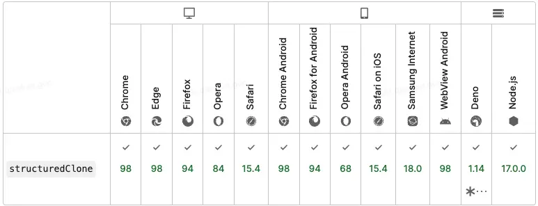 structuredClone 是在 ECMAScript 2021(ES12)標準中引入的,ECMAScript 2021 規範正式發佈於 2021 年 6 月