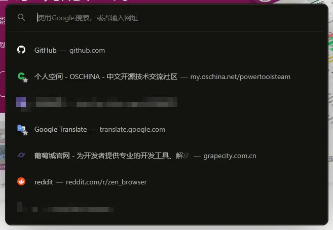 火狐退出中國後,其「新標籤頁」的「海外內容推薦」成了擺設,還充斥着無關廣告。Zen 乾脆去掉了新標籤頁,點擊「新建標籤」時會彈出一個「懸浮搜索框」------像 macOS 的 Spotlight 或 Windows 的「開始菜單搜索」一樣,既能輸入網址、搜索關鍵詞,還能直接查找已有的標籤和書籤。