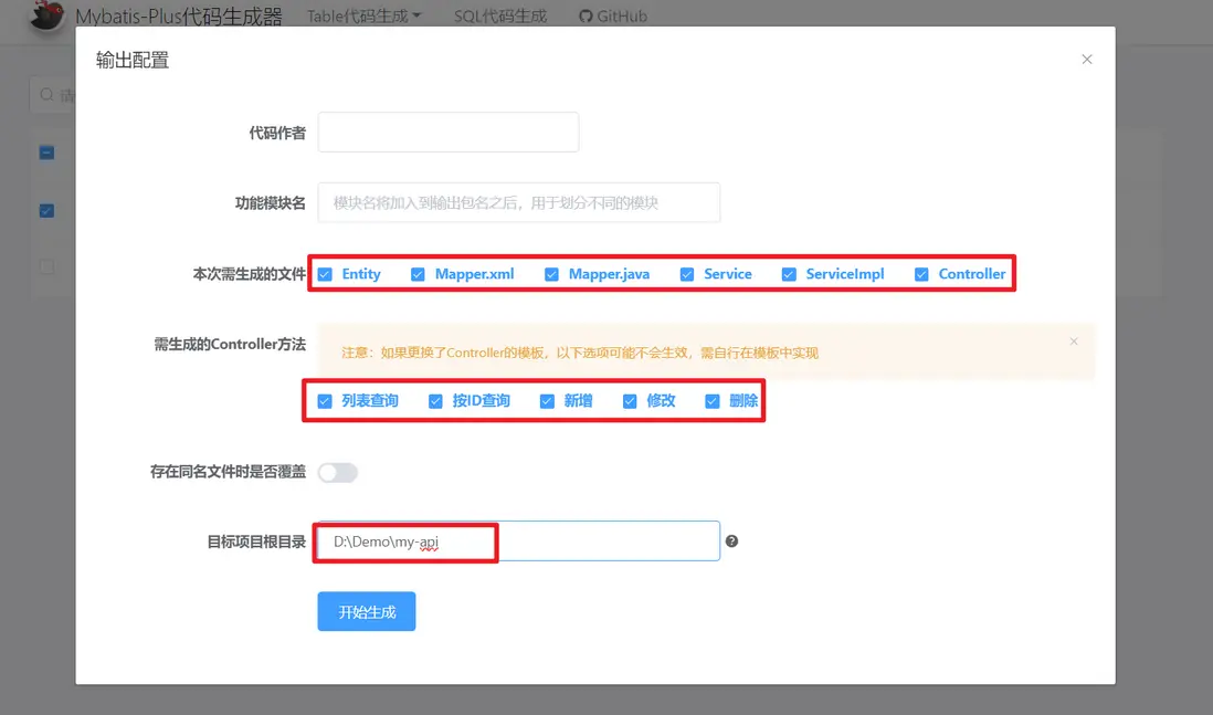 然後返回到上一個頁面,選擇你要生成接口的數據庫表,點擊“代碼生成”,勾選所有“本次需要生成的文件”的複選框,修改“目標項目根目錄”為api服務的根目錄。其他配置可以不填,點擊開始生成,api服務下就已經生成好所有勾選的文件了: