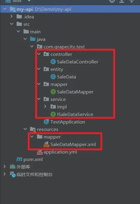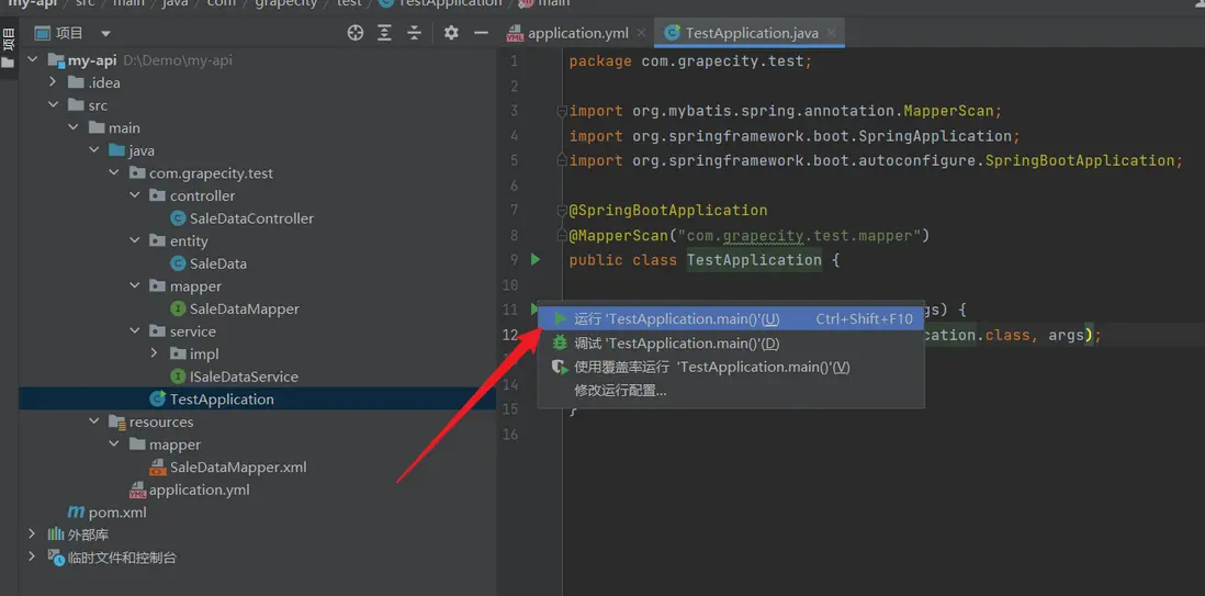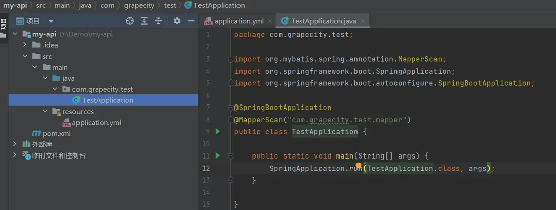 TestApplication.java是Springboot的入口文件,除了必要的引入外,還規定了要掃描的Mapper。