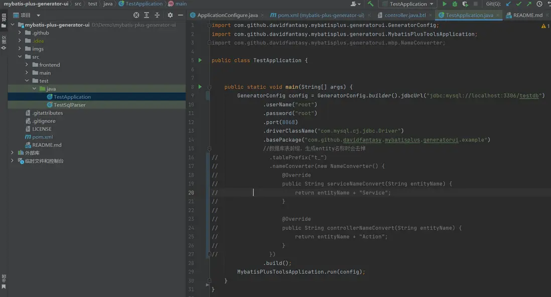 TestApplication.java是生成器的啓動文件,直接讀取數據庫中的表。