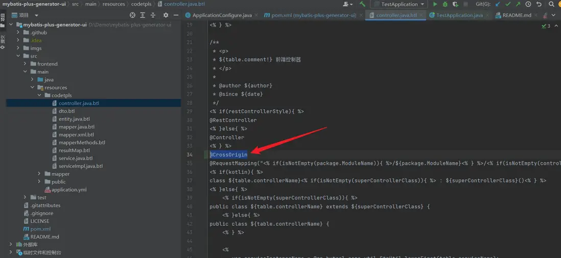 Controller.java.btl是生成controller的模板文件,開源項目的源碼中未開啓跨域,這裏為了本地測試,我開啓了跨域,讀者後續有其他需求,也可以在codetpls目錄下找到對應的模板文件,按需增減。