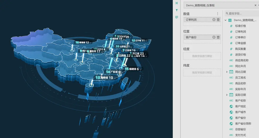 - 數值+位置:數值表示想要顯示的數據,如下圖中的數值是訂單利潤;位置表示數值信息在地圖上顯示的位置,如下圖中的位置是省份。