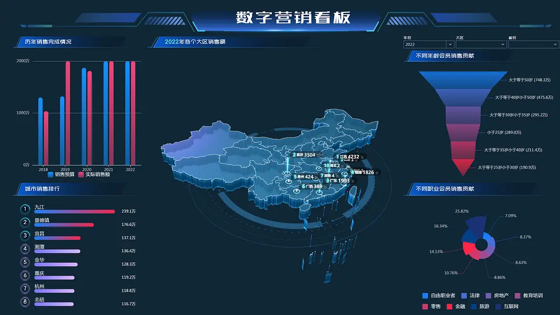 某企業在全國範圍內銷售產品,為了更好地瞭解不同地區的銷售情況,他們使用了三維地圖柱形圖來展示數據。在地圖上,不同地區的柱形高度代表了該地區的銷售量。通過觀察柱形圖,企業可以直觀地瞭解到哪些地區的銷售情況較好,哪些地區的銷售需要加強。可以根據需求,設定所需要展示的區域。