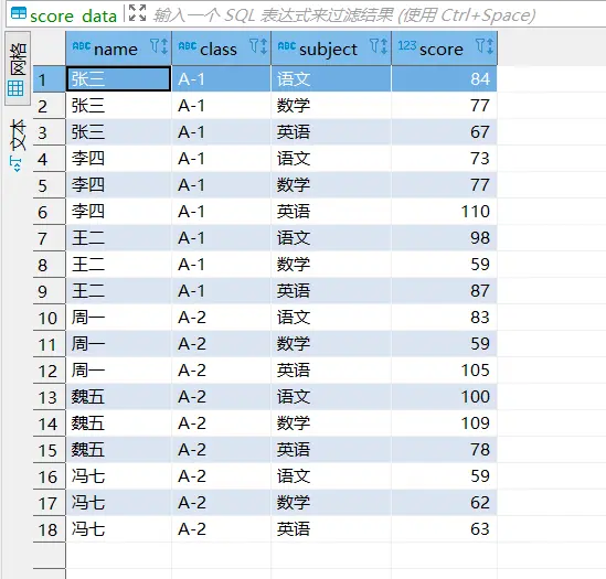 為了讓大家更好的理解,我將以學生數據作為查詢的條件背景:假設現在某個學校的某個年級的同學完成了一次考試,成績也已經錄入到數據庫中: