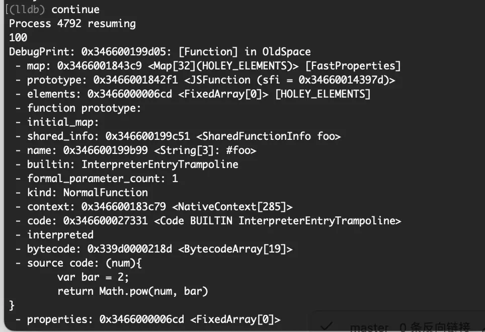 3. 輸入 continue 繼續, 可以看到 foo(10) 的打印結果,同時可以看到打印的 foo, 最後再次進入斷點