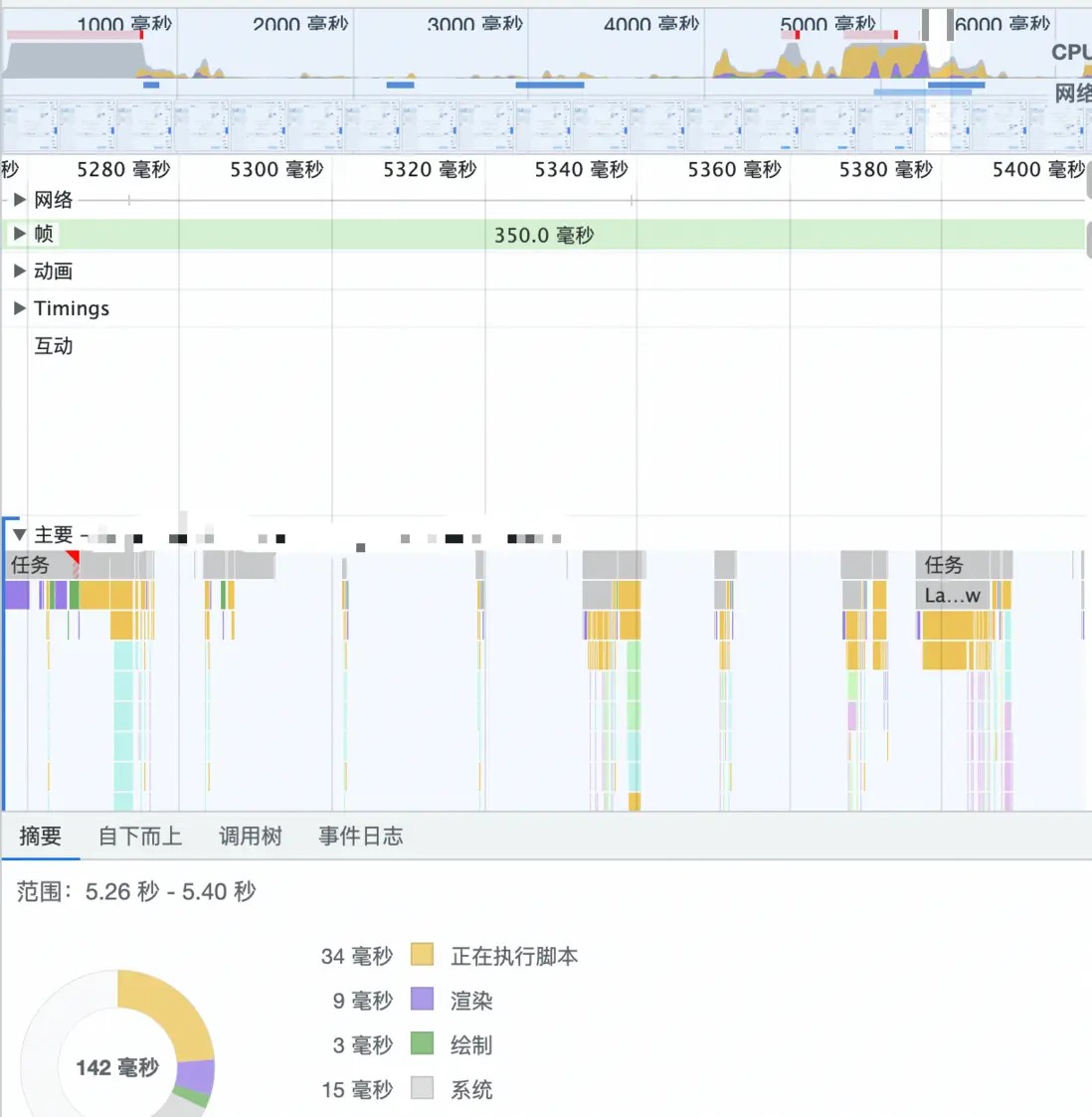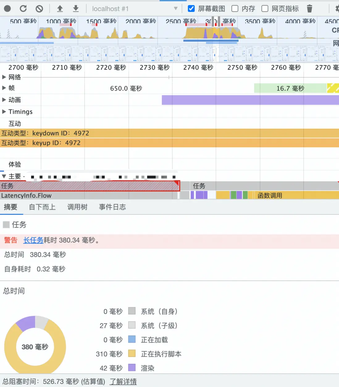 既然是卡頓,那當然屬於性能方面的問題 ,這裏就輪到 Chrome 的性能監控出場了: 重複步驟, 最後縮短監控範圍, 點擊卡頓的任務