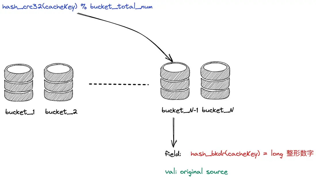 需要將這麼多維度的數據通過 hash 算法,均勻、離散的分攤到這些個 bucket 內,必須選擇業內比較有名且碰撞率不高的優秀算法。可以選擇 crc32(key) % bucketNum,得到該存在哪個 bucket 內,此時再使用 hash 算法(需要考慮前後兩次 hash 的碰撞率,建議選擇與分桶算法不一致)或者直接使用 Java 對象的 hashcode 作為 field 即可,整體效果如圖: