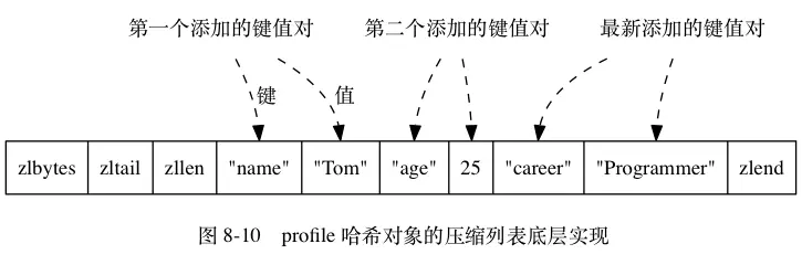 ziplist 編碼的哈希對象使用壓縮列表作為底層實現, 每當有新的鍵值對要加入到哈希對象時, 程序會先將保存了鍵的壓縮列表節點推入到壓縮列表表尾, 然後再將保存了值的壓縮列表節點推入到壓縮列表表尾, 因此: