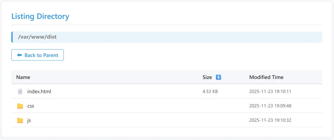 在開發運維後台或者日誌查看服務時,我們經常需要一個界面來查看服務器上的文件列表。自己寫前端頁面解析 JSON 很麻煩,StaticFS 直接提供了一套現成的 Web UI 和 JSON API。