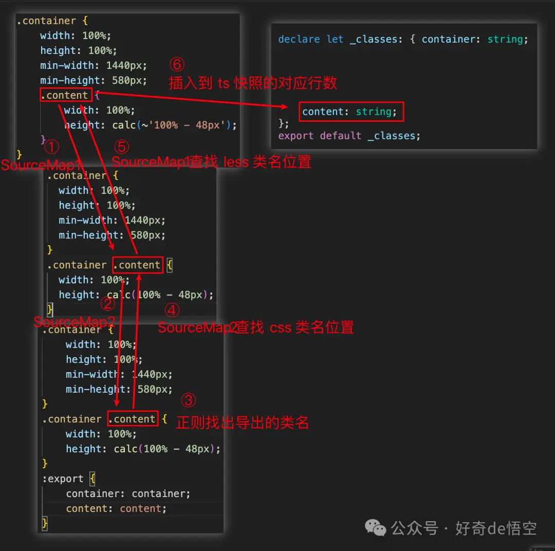 less 編譯 app.module.less 產生 SourceMap1,postcss 再次編譯產生 SourceMap2,再利用 SourceMap2 找到類名的源碼位置後,生成 d.ts 文件。