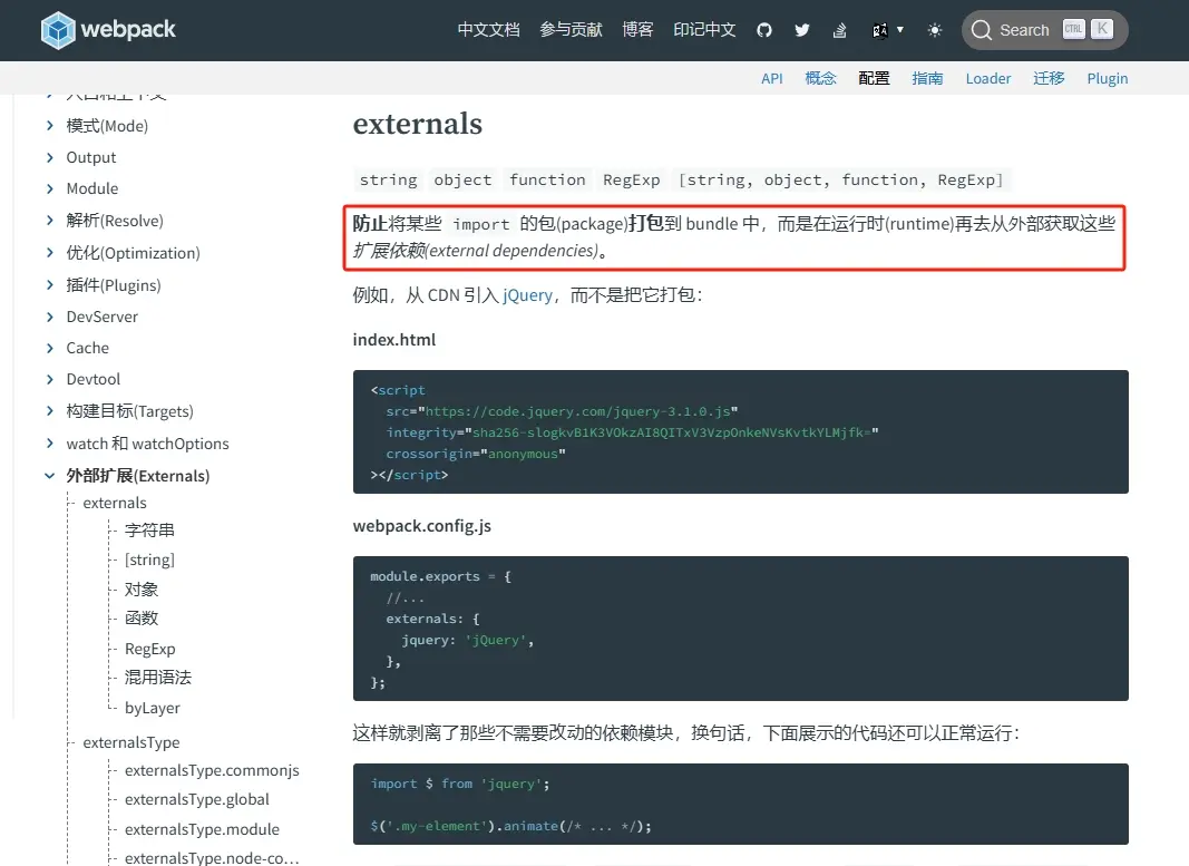 webpack配置文件中可以通過externals來配置外部擴展,它支持字符串、對象、函數、正則類型的值。符合externals的模塊不會打包進最終的產物中。