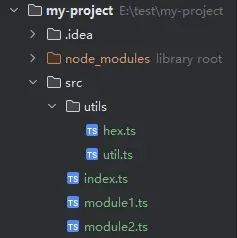 假設你現在要在npm上發佈一個js庫,你的庫裏有module1.jsmodule2.js2個模塊,這2個模塊都依賴了hex.js工具模塊,如果使用普通的