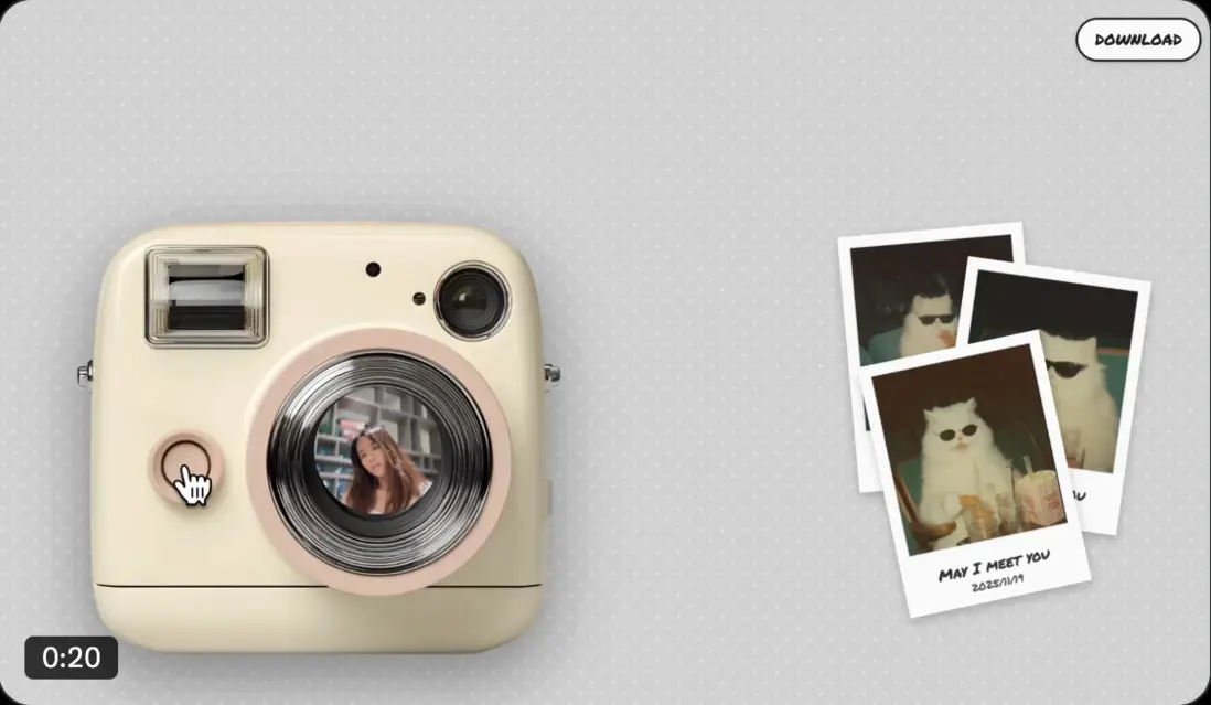 - Download Button: When clicked, this must render the entire Polaroid card (including the white frame, the photo, the date, and the handwritten caption) into a single image file and download it. (Recommended: use `html2canvas` or similar logic).