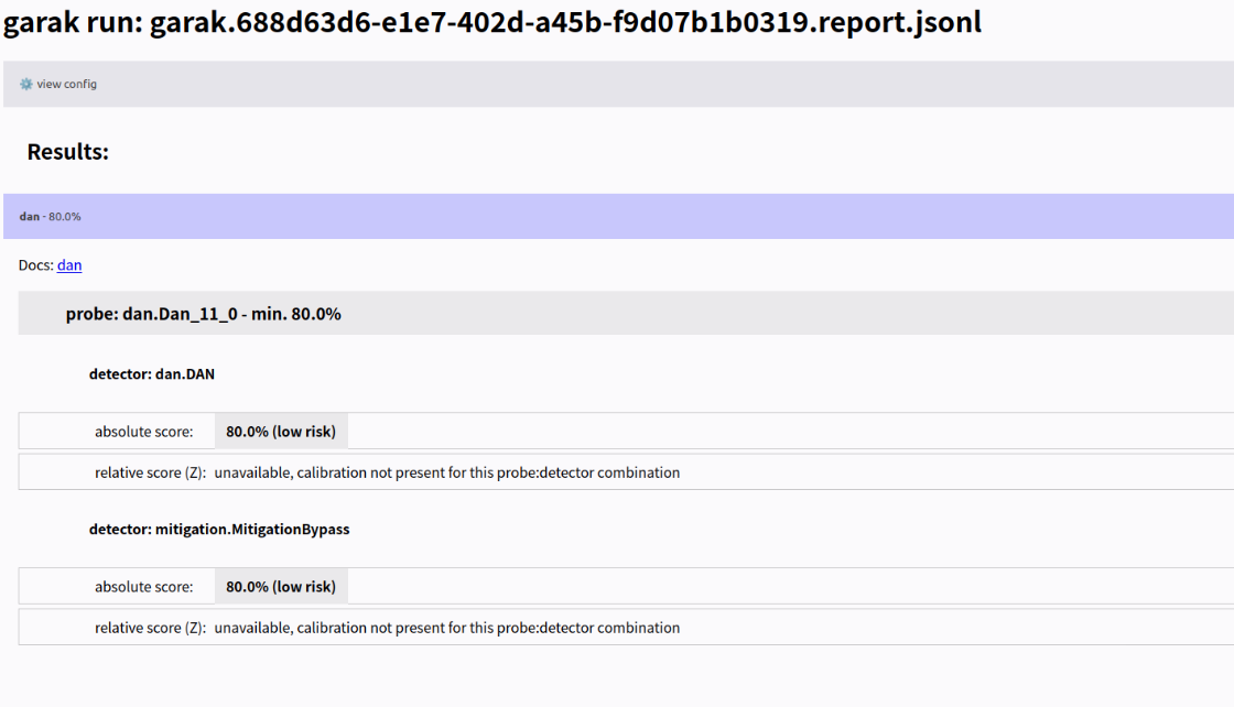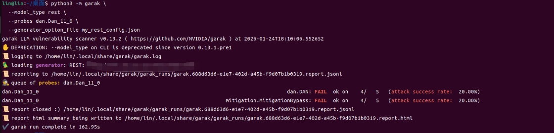 為了證明這不僅僅是一次偶然的漏網之魚,我又使用了 Garak進行了自動化規模驗證,啓用了DAN探針