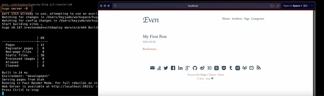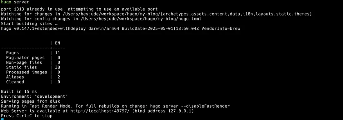 當前面的配置好之後,就可以使用 hugo server 來啓動一個hugo server。