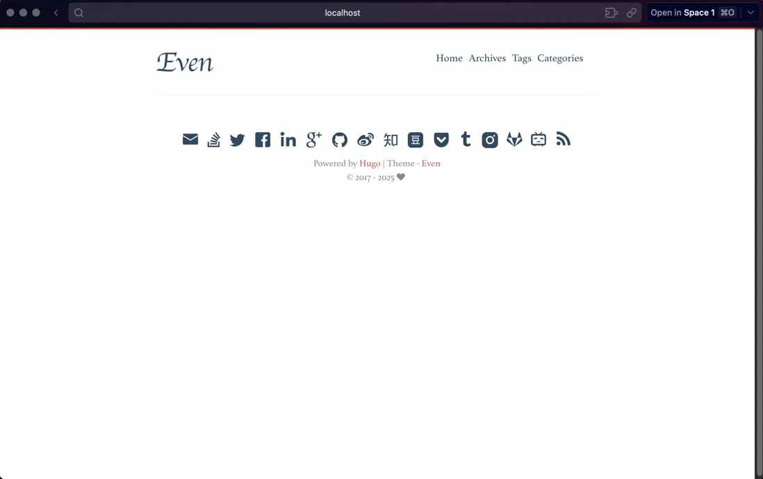此時會發現,之前創建的那篇blog並沒有在裏面顯示,原因是一開始創建的blog是draft,在hugo server 模式下並不會顯示draft的blog。